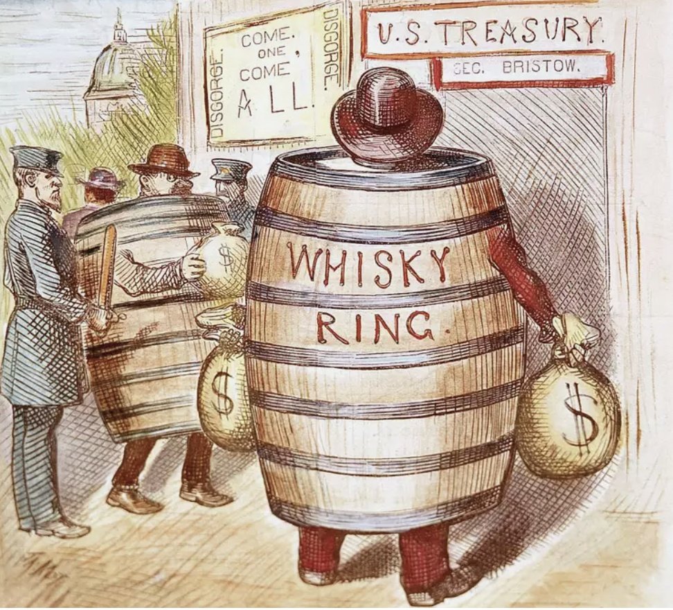 Whiskey Ring – Distillers were bribing treasury officials, including Orville Babcock, Grant’s private secretary, to avoid alcohol excise taxes, costing the government an estimated $1.5 million annually. Grant testified in court in support of his secretary.