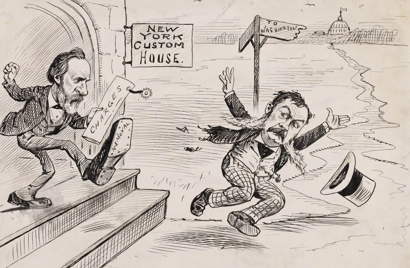 At the time, tariffs were the federal government’s largest source of revenues. And the port of New York collected the majority of that tariff revenue. It was a significant source of patronage controlled by Senator Roscoe Conkling and run by Conkling’s ally, Chester Arthur. Hayes wanted to replace Arthur, stating, “The public interest requires that the Custom House be conducted upon principles of efficiency and integrity, not partisan control.” An independent study of the New York Custom House (the government body responsible for tariff collection), known as the Jay Commission, concluded that “ appointments are made not upon merit, but upon political influence. The result is a bloated payroll, with many officers whose duties are nominal or unnecessary.” In an ironic twist, as we will see in a future article, Chester Arthur will play a major role in Civil Service reform.